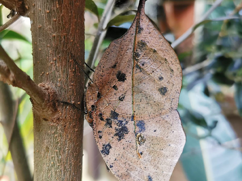 Durch seine besondere Flügelfarbe und -form, die eher eckig ist, ist er sehr gut getarnt. Die Unterseite der Flügel zeigt sich neben der bräunlichen Tarnfarbe mit einer hellbraunen Äderung, welche die Flügel im ruhenden, zusammengeklappten Zustand aussehen lässt wie ein trockenes, welkes Blatt! Zudem zeigen sich beide Flügel mit einer Mittelrippe und die Hinterflügel mit einem zusätzlichen Fortsatz (Sporn), der dem Stängel eines Blattes ähnelt.
